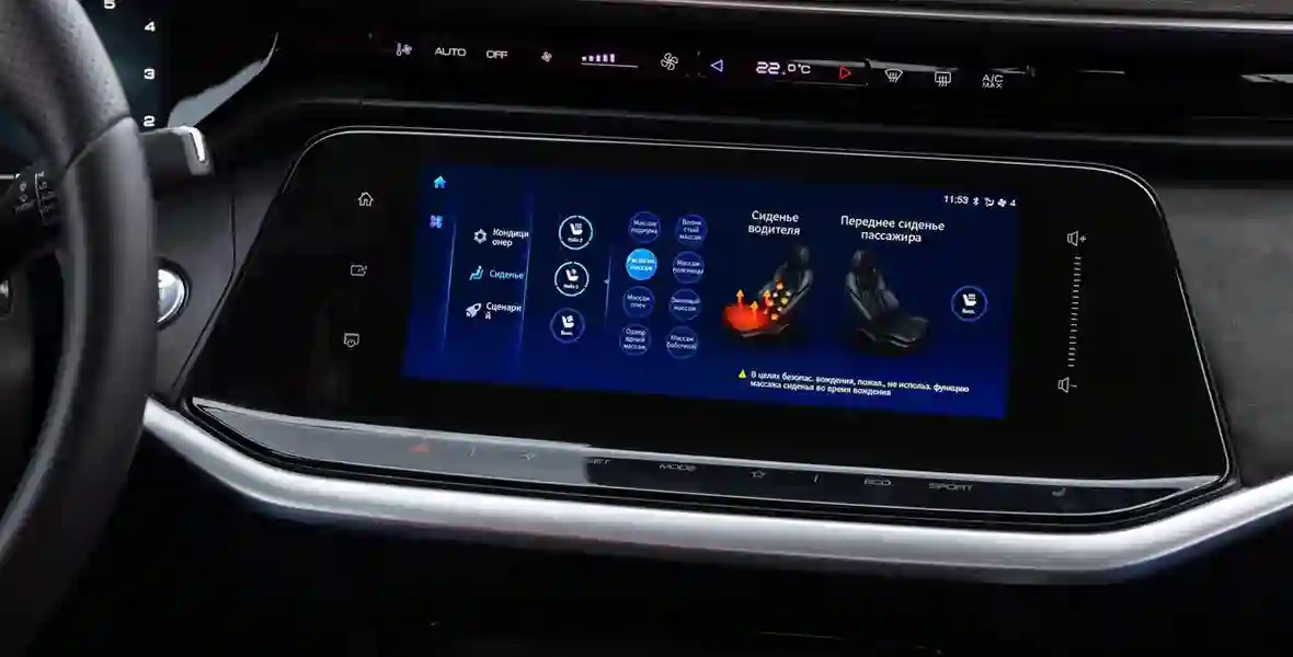 Двухспицевый руль — без сенсоров, вместо них — привычные блоки кнопок. Несколько старомодные внешне, но от этого не менее удобные. Совсем без тач-панелей Shine Max не оставили: сенсоры собраны под центральным дисплеем и над ним, где располагается блок, отвечающий за основные настройки климат-контроля. Причём они слушаются даже пальцев в тонких перчатках! Жаль только, что среди них нет управления подогревами сидений: за этим приходится «проваливаться» в меню мультимедийки.
